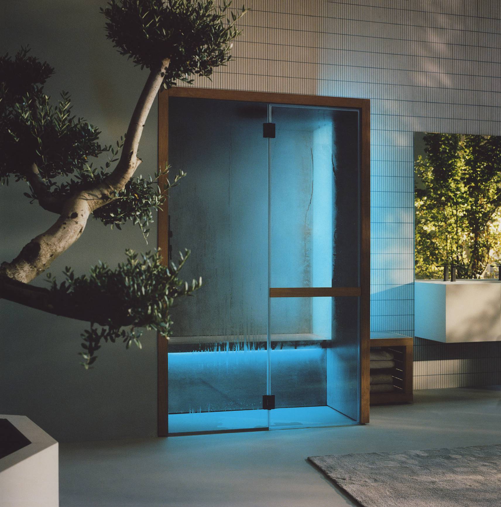 Yoku H è una cabina hammam prefabbricata firmata Effe pensata per chi desidera un sistema completo di bagno di vapore e doccia di facile installazione.